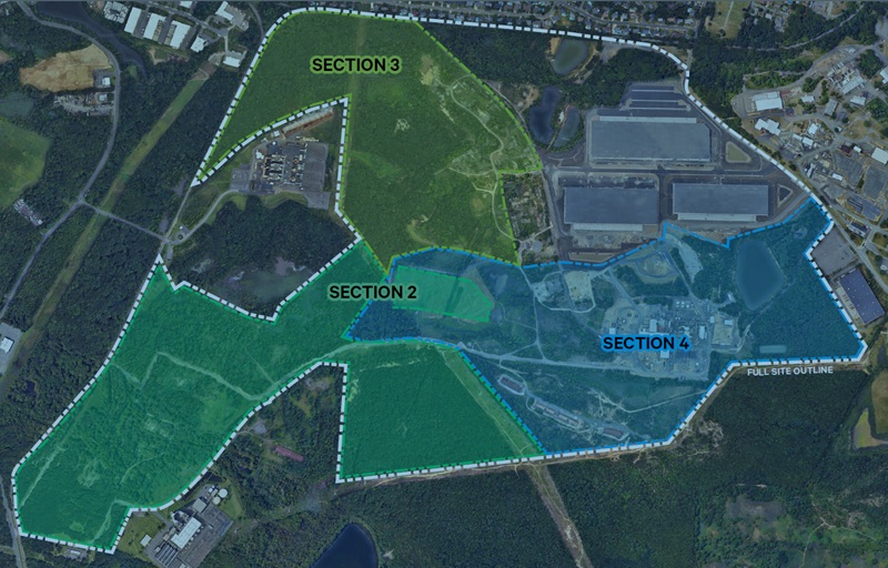 Brokers with CBRE are marketing the site, the largest swath of a nearly 600-acre redevelopment zone less than three miles from Route 9. That includes roughly 123 buildable acres to the east of Jernee Mill Road with the potential to build nearly 850,000 square feet of industrial space across four buildings, according to a conceptual site plan described by the listing team.