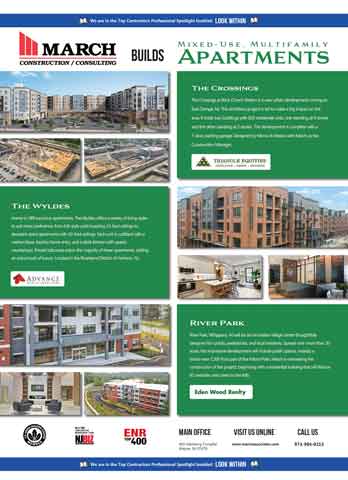 River Park, Whippany, NJ will be an innovative village center thoughtfully designed for cyclists, pedestrians, and local residents. Spread over more than 20 acres, this impressive development will include public spaces, notably a brand-new 7,200-foot part of the Patriot Path. March is overseeing the construction of the project, beginning with a residential building that will feature 81 riverside units (seen to the left).
