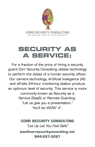 For a fraction of the price of hiring a security guard Corr Security Consulting utilizes technology to perform the duties of a human security officer. Our camera technology, Artificial Inelegance (AI) and off-site 24-hour monitoring station produce an optimum level of security. This service is more commonly known as Security as a Service (SaaS) or Remote Guarding.