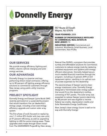 Natural Gas (NJNG), a program that provides turnkey and affordable solutions for commercial customers to reduce energy costs by replacing outdated equipment and systems with energy- efficient alternatives. Donnelly helped secure much-needed financial incentives through the program, including a 0 percent APR on-bill repayment option, resulting in no upfront out- of-pocket expenses for the dealership.