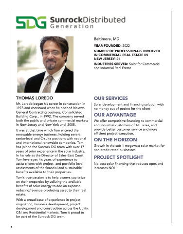 It was at that time which Tom entered the renewable energy business, holding several senior-level and C-suite positions with national and international renewable companies. Tom has joined the Sunrock DG team with over 17 years of prior experience in the solar industry. In his role as the Director of Sales-East Coast, Tom leverages his years of experience to assist clients with project- and portfolio-level assessments of the financial and sustainable benefits available to their properties.